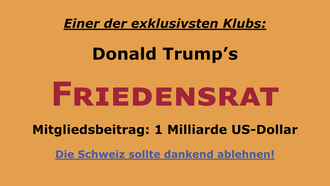 Kein schweizerischer Beitritt zum Trump Friedensrat!- Schweiz kann die geforderte eine Milliarde viel sinnvoller einsetzen! - Schweiz würde durch den Beitritt sein Ansehen dadurch weiter beschädigen! Passender Artikel-Link dazu: https://de.euronews.com/2026/01/22/friedensrat-trump-putin-lukaschenko Weitere interessante Artikel durch Google-Suche nach Trump Friedensrat erreichbar!2 von 100 UnterschriftenGestartet von Robert Weber