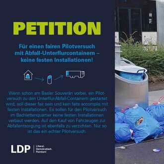 Petition für einen fairen Pilotversuch mit Abfall-Unterflurcontainern – keine festen Installationen!Wenn schon am Basler Souverän vorbei, ein Pilotversuch zu den Unterflur-Abfall-Containern gestartet wird, soll dieser fair sein und kein faits accomplis mit festen Installationen. Es sollen für den Pilotversuch im Bachlettenquartier keine festen Installationen verbaut werden. Auf den Kauf von Fahrzeugen zur Abfallentsorgung ist ebenfalls zu verzichten. Nur so ist das ein echter Pilotversuch. Nur wenn die Installationen, nach einer negativen Beurteilung durch das Volk wieder ohne Baumassnahmen und extra Kosten rückgebaut werden können ist es ein fairer Versuch100 von 200 UnterschriftenGestartet von Philip Karger