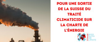 Pour une sortie de la Suisse du traité climaticide TCELe Traité sur la charte de l’énergie est un accord international qui protège les investissements d’investisseurs étrangers dans le secteur de l’énergie, en particulier les énergies fossiles, pendant des dizaines d’années. Il est considéré par le GIEC comme un frein de la transition énergétique et constitue un obstacle majeur au respect de l’Accord de Paris [1]. Il possède notamment un mécanisme dangereux permettant d’attaquer des États en justice et réclamer des compensations financières, lorsqu’une politique climatique ambitieuse est mise en place par exemple, et ceci est arbitré dans le plus grand secret dans des tribunaux privés. Il existe plusieurs exemples de litiges en France, au Pays-Bas ou au Royaume-Uni, où des investisseurs ont exigé des millions en compensation. L’accord contient également une “clause de survie” qui protège les investissements encore durant 20 ans même une fois sorti du traité : chaque année de plus au sein du traité est une année de plus perdue dans la sortie des énergies fossiles et la lutte contre le réchauffement climatique. Le dernier rapport du GIEC est formel : les installations existantes et les projets planifiés dans les énergies fossiles excèdent probablement déjà le budget carbone pour rester sous la barre des 1.5°C, et il est donc nécessaire d’arrêter le financement de tout nouveau projet dans les énergies fossiles et rediriger les flux financiers vers des énergies et technologies bas carbone [1]. Pour la première fois, le 9 novembre 2022, le Conseil fédéral a considéré une éventuelle sortie de ce traité dangereux pour la protection du climat, compte tenu de l’évolution du contexte politique [2]. Faisons en sorte qu’il en sorte et respecte ses engagements climatiques! Sources: [1] IPCC AR6 WGIII, Climate Change 2022 : Mitigation of Climate Change, https://www.ipcc.ch/report/ar6/wg3/ [2] Conseil fédéral, Énergie: le Conseil fédéral adopte la nouvelle mouture du Traité sur la Charte de l’énergie, https://www.admin.ch/gov/fr/accueil/documentation/communiques.msg-id-91286.html1.093 von 2.000 UnterschriftenGestartet von Swiss Youth for Climate