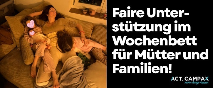 - Einen gesetzlichen Anspruch auf mindestens 6–8 Wochen staatlich finanzierte Wochenbett-Unterstützung nach jeder Geburt, inklusive pflegerischer Begleitung und Haushaltshilfe (kochen und putzen) und Entlastung mit anderen Kindern.